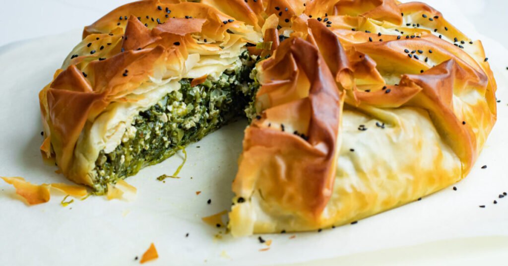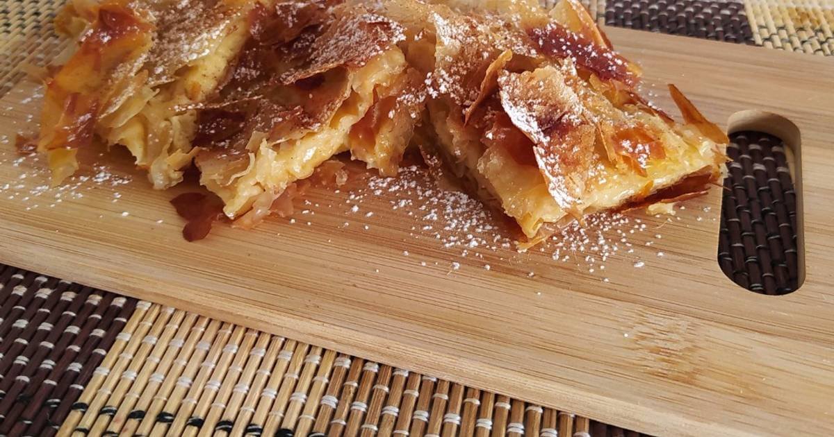A flaky phyllo pastry, filled with either custard (sweet) or cheese (savory), and often topped with powdered sugar and cinnamon. It’s a popular breakfast or snack in Greece, best enjoyed with Greek coffee.